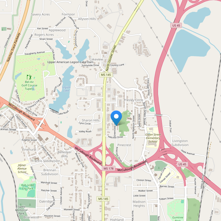 Отель расположен в городе Тупело, штат Миссисипи, рядом с торговым центром Молл эт Барнс Кроссинг. Этот городок известен тем, что здесь родился и провел свои первые годы король рок-н-ролла Элвис Пресли.