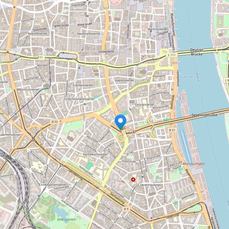 Отель расположен в центре оживленного Кёльна в популярном районе Северинсфиртель. Всего за пару минут вы можете добраться до старого города, собора, главного вокзала, стадиона Lanxess Arena и выставочного центра. В 2 остановках от станции метро Severinstrasse находится концертно-спортивный комплекс Ланксесс-Арена, а в 3 остановках Торгово-выставочный центр Кёльна.