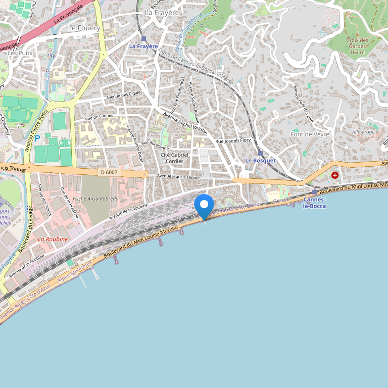 Отель расположен в популярном районе Канн La Bocca, в 3 км от центре города и бульвара La Croisette. Международный аэропорт Nice Côte d’Azur находится в 27 км от отеля.