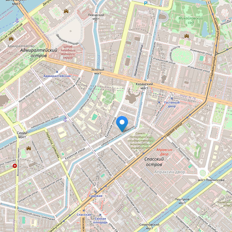 Расположение: в непосредственной близости от основных исторических достопримечательностей Санкт-Петербурга: Дворцовая площадь, Зимний дворец, Казанский собор, Невский проспект, Исаакиевский собор, Медный всадник и Адмиралтейство. Рядом со станциями метро "Невский проспект" - "Гостиный двор", "Сенная площадь" - "Садовая". Рядом, у Казанского собора, находится круглосуточная автостоянка. Вход в отель через арку дома №23 по ул. Гороховой.