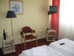 Поселили на третьем этаже. Номер небольшой, две кровати, две тумбочки, два кресла, столик и маленький телевизор. На полу ковролин. В прихожей шкаф-купе с вешалками и полками. Санузел раздельный. Очень не хватало мини-бара - привезли из Вены шоколад, хранить негде, в итоге повесили пакет на ручку полуоткрытого окна.) Ещё не понравилось...