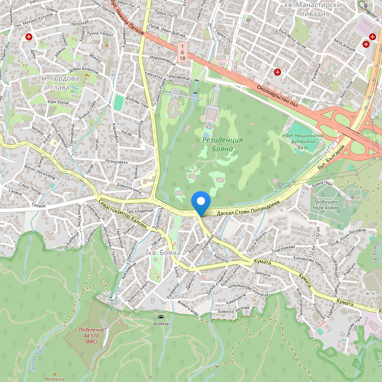 Отель расположен в фешенебельном пригороде Бояна, в 9 км от центра города Софии. Рядом с отелем находятся исторические, природные и культурные достопримечательности. Также Вы сможете посетить одни из лучших горнолыжных склонов на горе Витоша в нескольких километрах от отеля. Расстояние до центральный автовокзала Софии составляет 9,8 км. Также Вы сможете посетить национальный театр «Иван Вазов» в 8,7 км от отеля.