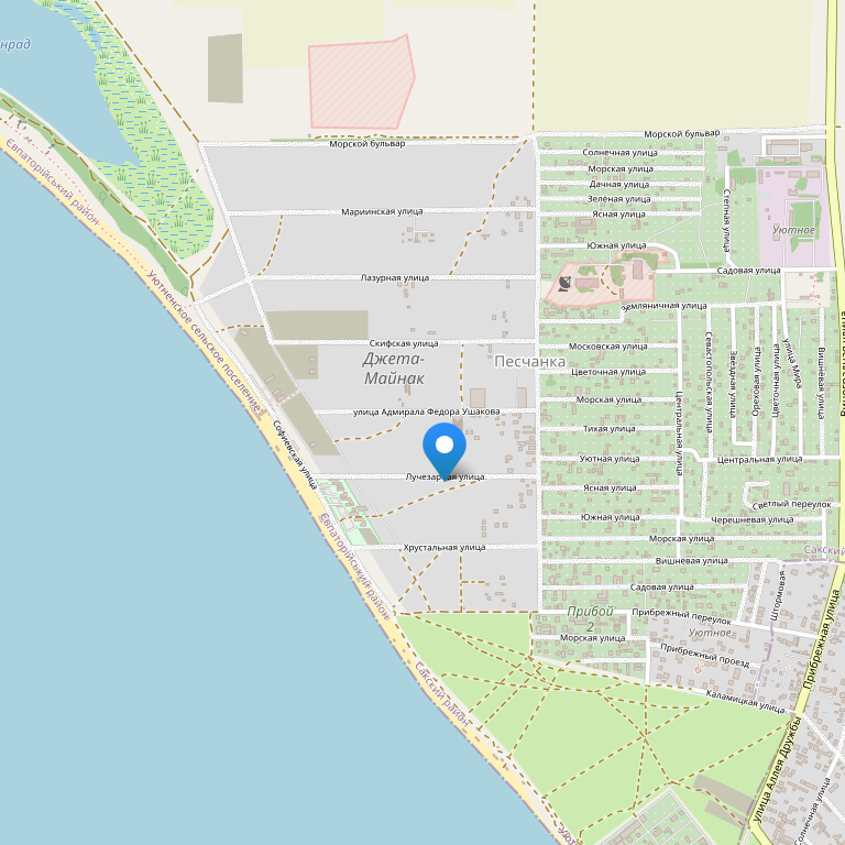 Отель расположен в пригороде Евпатории, на Песчанке. От отеля до остановки 10 минут ходьбы. Городской автобус довезет Вас прямо до дверей большого супермаркета, здесь же большой городской рынок. До ближайшего пляжа 8 минут ходьбы, 750 метров, через поле.