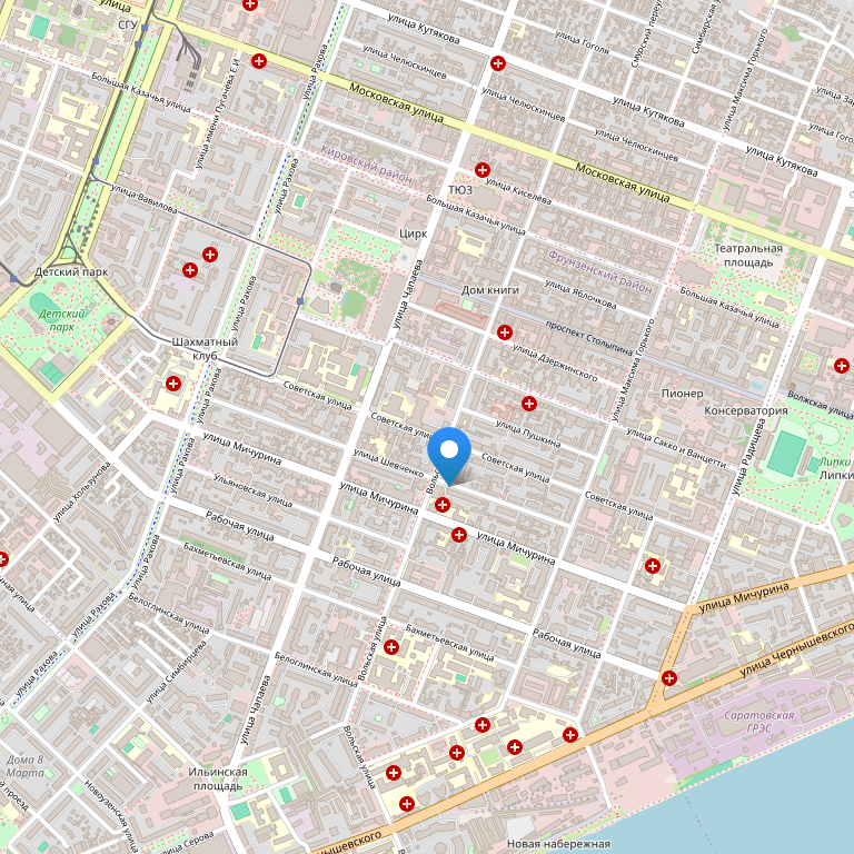 Хостел расположен в центре города, имеет массу преимуществ в доступности городской инфраструктуры, удобном расположении транспортных развязок и обилии достопримечательностей, расположенных неподалёку от гостиницы. Такое расположение имеют далеко не все отели в Саратове. Рядом с местом проживания находится площадь Киров, цирк братьев Никитиных и детский парк развлечений. В шаговой доступности находится железнодорожный вокзал, а в 15 минутах ходьбы – красивейшая набережная на Волге.