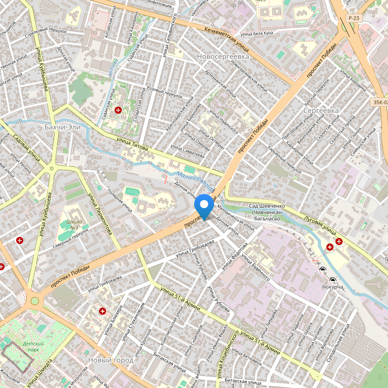 Отель расположен в тихом районе недалеко от центра города. В шаговой доступности от отеля – парковая зона с рекой Салгир, большой вещевой и продуктовый рынок, магазины и кафе, в 10 минутах езды – большой торговый центр FM. Деловой и культурный центр города находится практически рядом с отелем, на расстоянии 1 км, это всего 5–7 минут езды на машине или маршрутном такси.