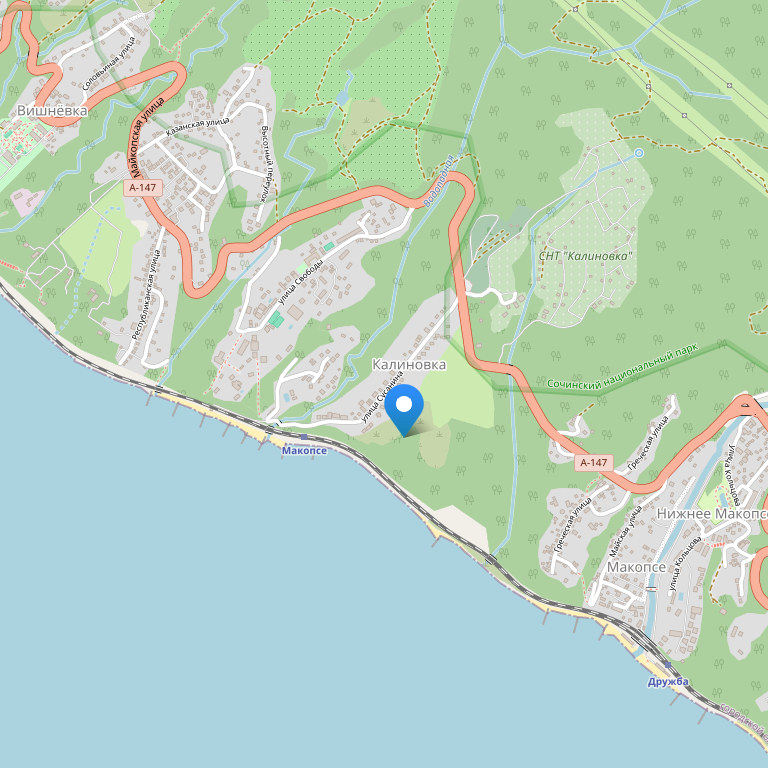 Отель расположен в Лазаревском районе Большого Сочи, в поселке Макопсе, очарование которого основано не только на его горных пейзажах, но и на красивой парковой зоне, относящейся к Сочинскому национальному парку. Это живописное место идеально подходит для отдыха семей с детьми.