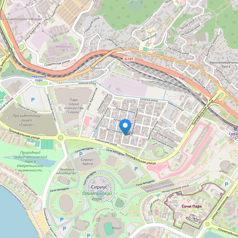 Отель расположен на Черноморском побережье, в живописном Адлере, всего в 5 минутах ходьбы от ж/д станции «Олимпийский парк», неподалеку от разнообразных кафе, баров и ресторанов, а вот чтобы добраться до Олимпийского парка необходимо совершить 15-ти минутную обзорную прогулку по городу. Железнодорожная станция Адлера находится в 7 км от отеля, до международного аэропорта Сочи можно добраться, проехав 9 км на транспорте.