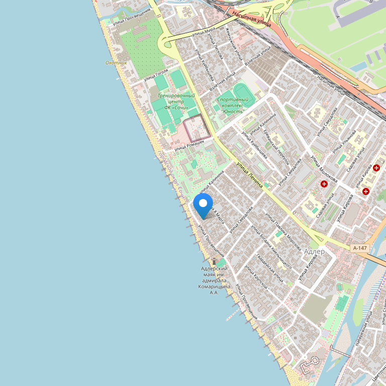 Отель расположен на Черноморском побережье, в курортном городе Адлер, всего в нескольких минутах ходьбы от берега моря, также неподалеку от кафе, ресторанов и магазинов, на расстоянии 2,8 км от ж/д вокзала Адлер и 4,5 км от международного аэропорта Сочи.