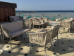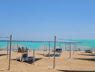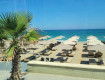 На пляже много лежаков(есть в виде кровати)