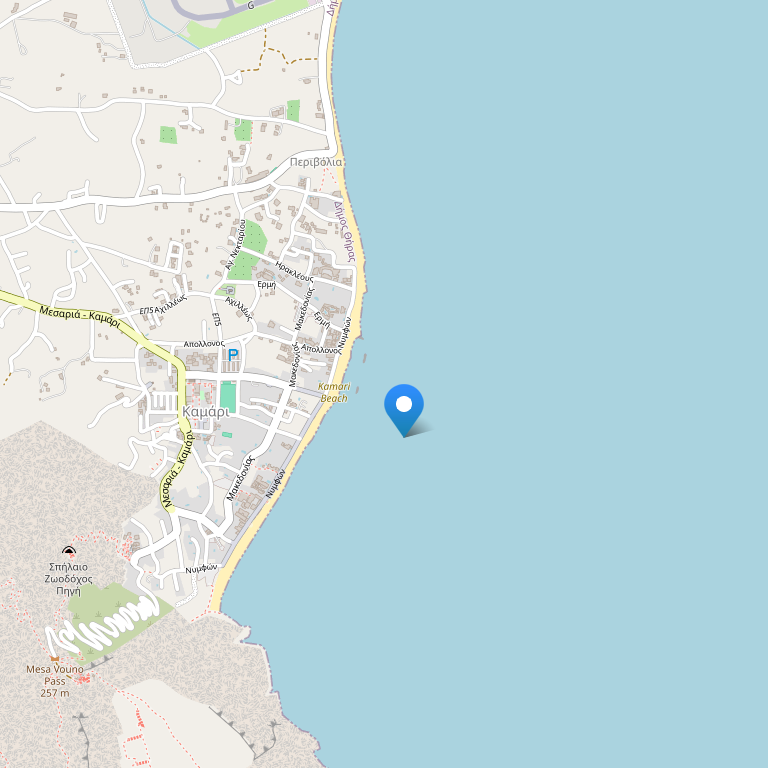 Отель расположен в городке Камари, в 5 км от аэропорта, в 10 км от порта, в 8 км от столицы острова города Фира, в 50 метрах от автобусной остановки.