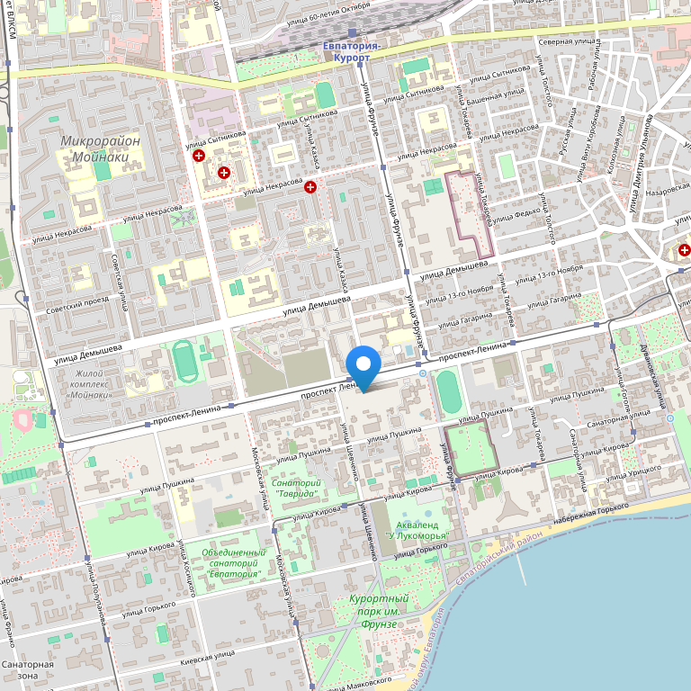 Санаторий расположен в центральной курортной части города Евпатория.