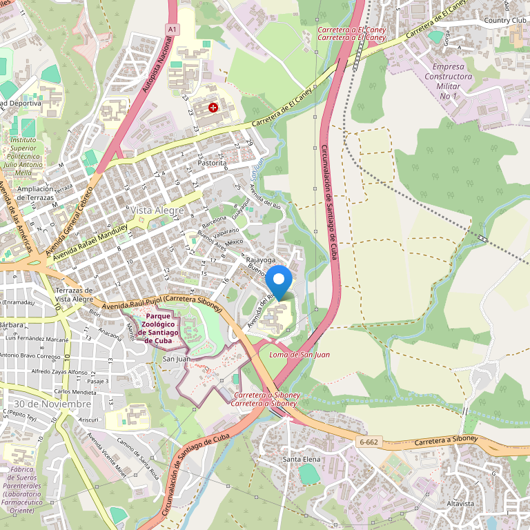 Отель расположен в 2,5 милях от центра Сантьяго де Куба в окрестностях Vista Alegre. Ближайший аэропорт находится в 14 км. от отеля.
