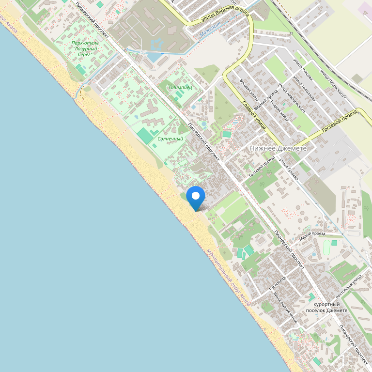 База отдыха расположена на Пионерском проспекте, в тени многолетних растений у самой кромки барханов, на берегу Черного моря, в районе поселка Джемете.