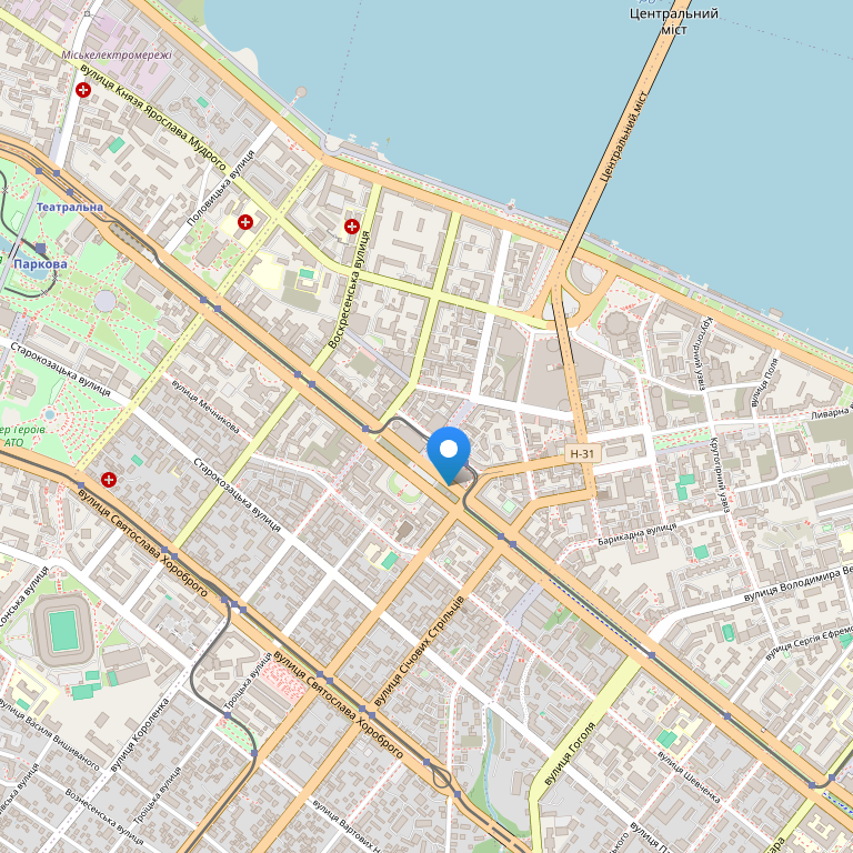 Отель расположен в деловом центре Днепропетровска в нескольких минутах ходьбы от административных и правительственных зданий, музеев и театров, торговых центров и основных магазинов города, ресторанов и казино.