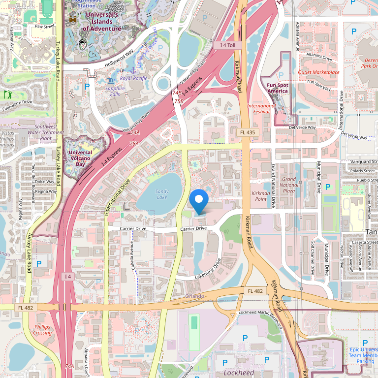 Отель расположен на пересечении Universal Drive и Carrier Drive, рядом с International Drive, в 2,4 милях от Orlando/Orange County Convention Center, в нескольких минутах езды от тематических развлекательных парков Sea World, Disney World, Universal, Wet n’ Wild, в 13 милях от международного аэропорта Орландо.