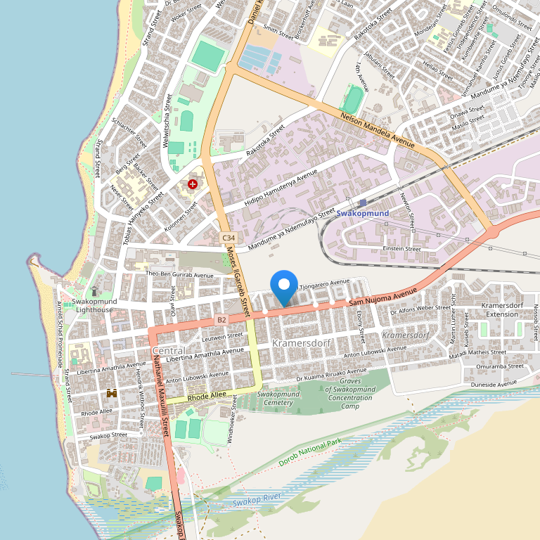 Отель находится в 5 минутах от центра города Свакопмун на углу Sam Nujoma авеню и улицы Kaiser-Wilhelm, в 15 минутах ходьбы от пляжа, неподалеку находится гольф клуб.