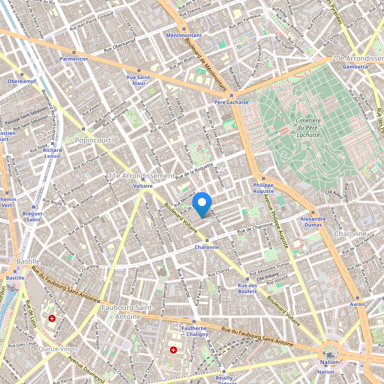 Отель расположен между площадью Бастилии, площадью Place de la Nation и знаменитым кладбищем Пер Лашез, где похоронены Джим Моррисона и Эдит Пиаф, в историческом центре Парижа. Район Marais и Лувр расположен всего в нескольких остановках на автобусе. Ближайшая станция метро Charonne (линия 9) находятся в 150 м от отеля. На метро вы сможете добраться до всех основных туристических достопримечательностей Парижа, включая Елисейские поля и Эйфелеву башню. До аэропорта ORY – 19 км.