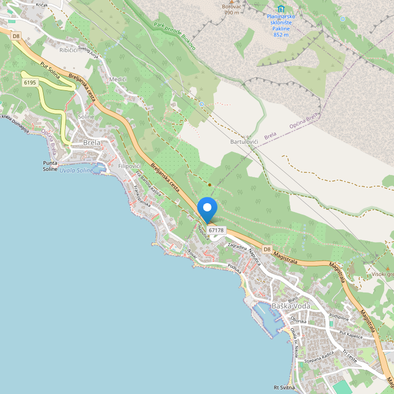 Отель расположен в прекрасном сосновом лесу в 500 метрах от городка Брела и в 3 км от города Башка Вода. 65 км от аэропорта г. Сплит, 11 км от г. Макарска. Отель был построен в 1969 году, полная реставрация в 2002 году.