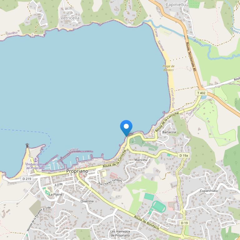 Отель расположен на пляже, за пределами корсиканского города Проприано. Из отеля открывается панорамный вид на море.