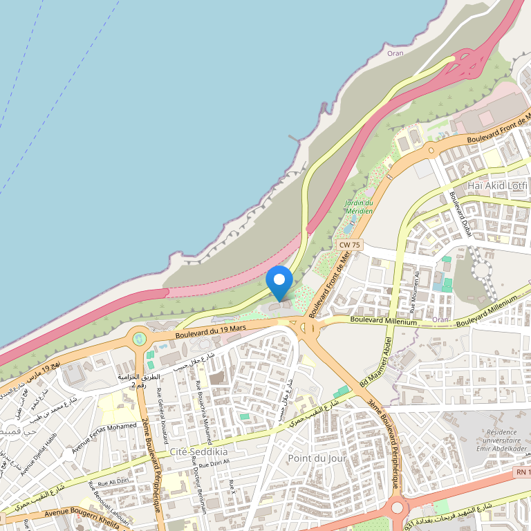 Отель расположен на берегу одного из самых красивых заливов Алжира, в жилом районе Canastel, недалеко от центра города, в 10 минутах езды от международного аэропорта и менее чем в 30 минутах езды от нового нефтяного комплекса Arzew.