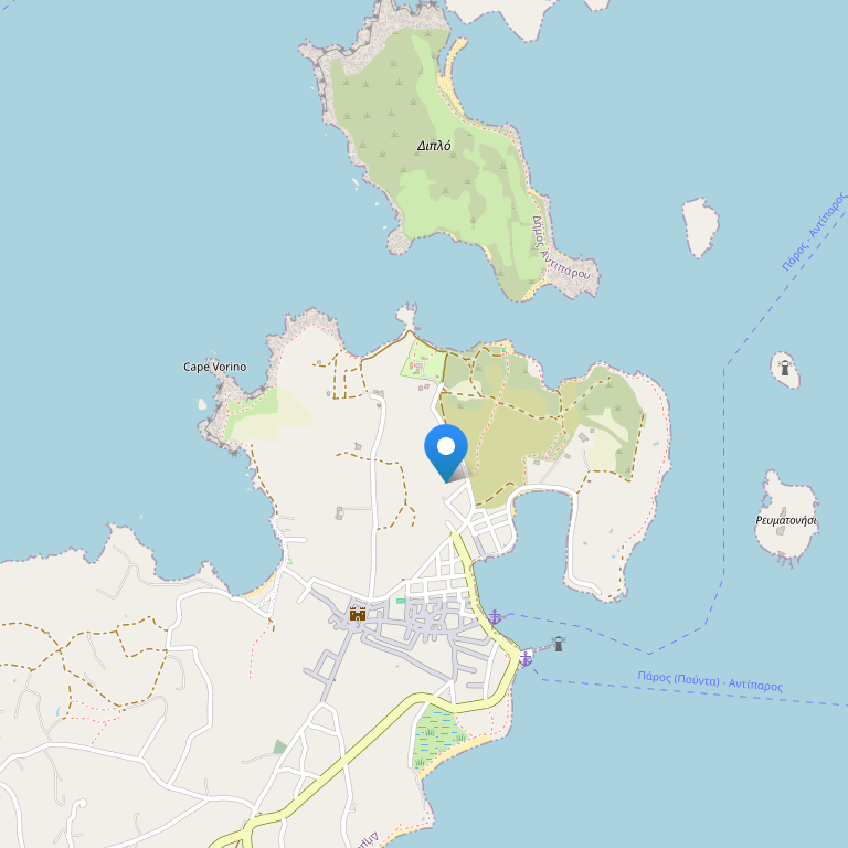Отель расположен на небольшом острове Антипарос (острова Киклады), в столице острова городе Антипарос, в 500 м от порта Антипарос, в 400 м от пляжа Agios Spiridonas Beach, в 700 м от