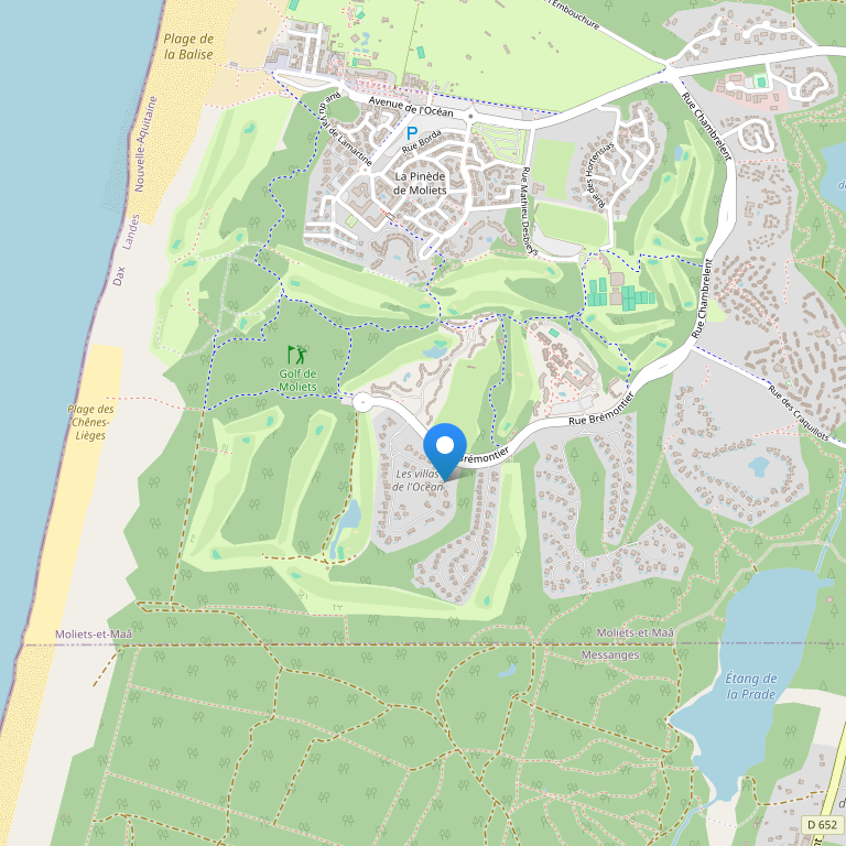 Комплекс находится на юге департамента Ланды, в самом центре сосновой рощи, в нескольких минутах ходьбы от океана и рядом со школой серфинга и полем для игры в гольф. Пляж находится в 1,5 км от комплекса, до него легко добраться пешком или на велосипеде. Расстояние до аэропорта BIARRITZ ANGLET BAYONNE – 53 км, железнодорожной станции DAX – 35 км, железнодорожной станции BAYONNE – 45 км.