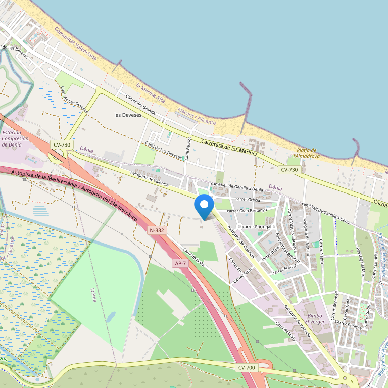 Кемпинг расположен в Дении, недалеко от соседних городов и туристических районов, таких как Javea, Benidorm, Calpe, Moraira и Altea. Кроме того, вы можете отправиться на множество увлекательных экскурсий – в Terra Mítica”, “Aqualandia”, “La Cova Tallasa”, “La Torre del Gero”, “Montgo”, “Cueva de las Calaveras” и “Peñon de Ifach”. Кемпинг находится на 203 км Национальной автомагистрали 332 Валенсия - Аликанте, в 500 м от границы между двумя этими провинциями. Отличный песчаный пляж – всего в 150 метрах от кемпинга.