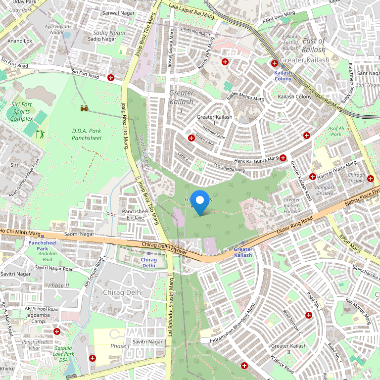 Отель расположен в южном Дели в фешенебельном районе Большой Кайлаш, всего в 2 минутах езды от площади Неру, в нескольких минутах езды от таких крупных торговых центров и достопримечательностей как Okhla, Mohan Co-operative, Connaught Place, South Extension, Lajpat Nagar, Masjid Moth, Hauz Khas и Green Park, а также в шаговой доступности от торговых центров Greater Kailash1 M-block Market, Greater Kailash1 N-block Market, Archana, Kailash, Greater Kailash 2 и Ansal Plaza. Отель находится в 35 минутах езды от международного аэропорта имени Индиры Ганди. Железнодорожные вокзалы Нью-Дели и Низаммуддин расположены в пределах 20-минутной езды на автомобиле.