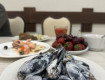 Здравствуйте, мясо: баранина, курица, индейка, телятина, рыба: дорадо, форель ( на завтрак копченая, на обед и иногда на ужин стейки на гриле), морской язык, ещё какая то белая рыба, если честно, не поняла по вкусу какая. С морепродуктами беда ( думаю, потому что не сезон) делали только пасту с мидиями и кальмаром и больше ничегошеньки🤷♀️, но во всяком случае за 8 евро с человека можно сходить в рыбный а-ля карт)