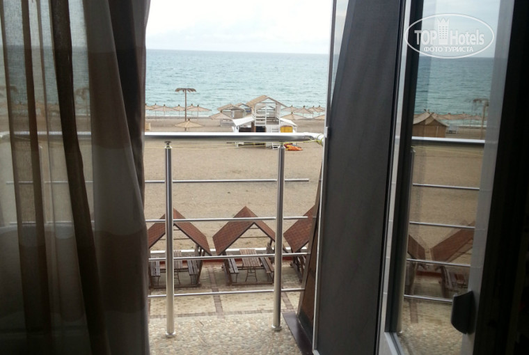 Отдельного внимания заслуживает вид с балкона (что касается практически всех номеров). Метров 50 до моря, метров 20 до пляжа. Выйдя на балкон, любуешься прекрасным видом, ни в одном заграничном отеле ничего подобного не видели. Что касается пляжа - песок, имеются лежаки и домики для отдыха, однако - платно, но многие, а точнее большинство, лежат на песочке. Народа немного, море чистое. Пляж красивый.