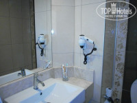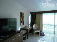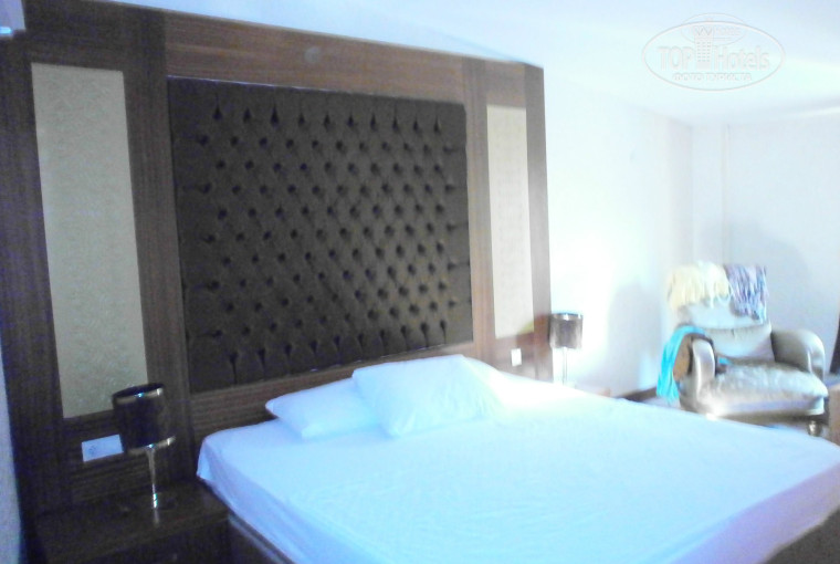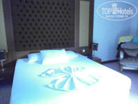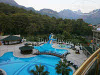 Летели с Пегасом (уже не в первый раз). Все своевременно, хорошо организовано. В отель прибыли около 12.30, заполнили анкеты, получили браслеты. У нас было оплачены 2 стандартных номера Н аресепшене сказали, что отель переполнен и предложили двухкомнатный люкс на 4-м этаже. Сходили, посмотрели. Номер хороший, большой, с ванной-джакузи, 2-мя туалетами, огромные панорамные окна с видом на горы. В одной комнате две раздельные кровати, шкаф-купе, туалетный стол с креслом, тумба, большой телевизор –плазма на подставке. Во второй комнате огромная кровать с красивым мягким изголовьем, туалетный стол с креслом, тумба, телевизор –плазма на стене (чуть поменьше) и шикарное кресло для сидения в небольшом эркере около кровати. Решили- переночуем, а на следующий день девушка с ресепшена обещала приготовить два номера с видом на фонтан. Но, естественно, все это было только обещанием. Все наши попытки перебраться на следующий день в раздельные номера не увенчались успехом. Да, в принципе, мы об этом не пожалели, так как площадь комнат в номере гораздо больше, чем в стандартных, сам номер уютнее, а вид из панорамного окна на горы просто потрясающий.