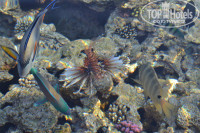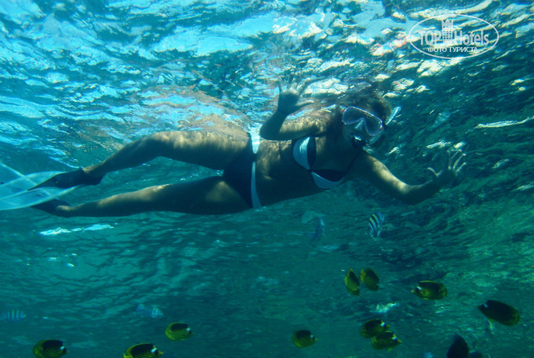Море. И потом мы пошли на пляж - все ушло на задний план, о таком море я даже не мечтала...) Красивенное море, короткий понтон, прекраснейший пляж, двух ярусный в скале + сверху на зеленых газончиках зонтики и матрасы, и множество рыбок всех цветов и оттенков, обалденные кораллы, всевозможных форм и размеров, это такое чудо! Я в диком восторге! Видели крылатку, скатов, большого наполеона, огромную мурену ...