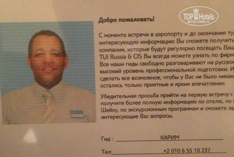 Мы не первый раз на отдыхе, в том числе и в Шарме, и немного понимаем что, где и как происходит... Мы отказались от экскурсий со стороны тур оператора (TUI), то есть не покупали у Карима, а купили в другом месте по более выгодной цене. Сегодня вечером подошли к Кариму с банальным вопросом: "Как можно будет уточнить у него не поменялось ли наше время вылета домой, можем ли мы позвонить ему за день перед вылетом?!" Т.к. в последний день мы будем в Израиле и вернемся поздно, и у нас просто не получится к нему лично подойти. Ответ был потрясающим: "Не надо мне звонить! Спросите гида у которого вы купили экскурсию-дешёвку, он Вам ответит..."