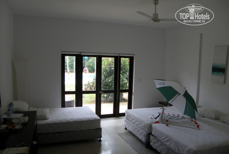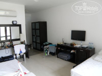 Если персонал на 5*, то наш номер был на 3*. Номер 203 был просторный, на первом этаже, с выходом к бассейну. Так как размещение у нас было 2+2, то в номере были 2 двухспальные кровати и 1 1,5 кровать. Мебели по-минимуму и она уже чуток потрепана. Из под мини бара подтекала вода. В номере телевизор, кондиционер, чайник с набором чай/кофе/сахар, ежедневно оставляли по 0,5 л бутилированной воды на человека. В ванной душевая кабинка, фен, шампунь, мыло, гель для душа. Очень напрягало отсутствие каких-либо ковриков на полу, а пол из кафельной плитки (пляж, песчаные дорожки по территории отеля, дети бегают туда-сюда и в итоге в номере на полу полно песка - босиком не комфортно ходить). В ванной убил 3-х тараканов. У номера есть типа терраса с двумя креслами и столиком, но терраса никак не ограждена и считай что ты просто сидишь за столиком в 2-х метрах от дорожки по которой ходят отдыхающие, короче как-то не приватно это, как и то что если не зашторить окна, выходящие на эту же террасу, то из номера получается отличный "аквариум", особенно вечером... Впрочем персонал был готов поменять нам номер, но выбор номеров под 2+2 небольшой, а близкое расположение к бассейну для нас нивелировало другие неудобства (дети постоянно под присмотром).
