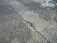 -ни о какой плитке около бассейнов речи не идет, только потрескавшаяся от времени цементная стяжка, с мусором в щелях (бычки, лейкопластыри, мокрые салфетки) и песок от разрушения этой стяжки (наш ребенок в первый же день порезала ногу и не могла зайти в морскую воду, т. к. соль раздражала рану);