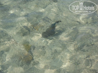 Зонтиков и лежаков всегда всем хватало. Песок на пляже крупный. За десять дней несколько раз наблюдали приливы и отливы. Во время отливов по берегу можно ходить смотреть рачков-паучков, а в приливы около берега плескались маленькие дети. Мы обычно ходили купаться на самый конец пирса. Ходить по пирсу нам не тяжело, ведь по разным сторонам плавают разнообразные рыбки (за десять дней они нам нисколько не надоели). С пирса можно прыгать, глубина большая, вдоль кораллов очень интересно плавать с маской. Только на седьмой день заметили, что под пирсом живет большая мурена, которую нам так хотелось увидеть. Есть еще заход на середине пирса, рыбок здесь намного меньше, глубина в отливы и заливы сильно различается, но максимум около лесенки это 1.4 метра.
