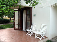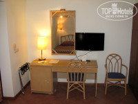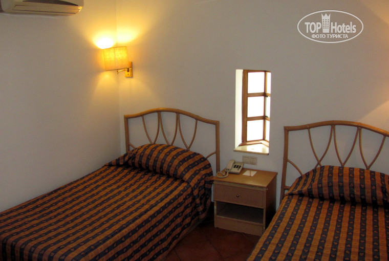 В 14-00 пришли на ресепшен. Изначально мы бронировали самый дешевый номер стандарт без балкона в основном здании. Татьяна посоветовала с балконом не заморачиваться, так как они в этом отеле очень маленькие и нет смысла за них переплачивать. Балконы в основном здании, действительно, очень маленькие! Вдвоем там развернуться было бы уже проблематично. Нам предложили заселиться в бунгало на первый этаж с террасой. Мы согласились, потому что терраса это все-таки лучший вариант, чем номер без балкона. Номер нам достался 1442 в шаговой доступности от всех злачных мест отеля. Биллбой бодренько подхватил наши чемоданы и покатил в сторону нашего жилья. Расположение номера понравилось. Терраса уютная, в окружении фруктовых деревьев. Но когда мы зашли в номер, то испытали настоящий шок! Я, конечно, настраивала себя на то, что будет все простенько, но не настолько!!! Комната темная, сырая. Окошечко очень маленькое. На полу плитка. Мебели не знаю уж и сколько лет! Очень старая и вся заляпанная белой краской! Две полуторных кровати. Отдать должное, матрасы были удобные. Подушки отвратительные, твердые. Наволочки в каких то пятнах., вместо одеяла непонятная вафельная тряпка (у меня половая дома получше выглядит!), и старые-престарые пледы, которые когда то были белыми и пушистыми. Одна тумбочка. Стол, два стула. Шкаф с виду смотрелся как трехстворчатый, но на самом деле оказался двухстворчатым. Третья створка была имитацией, под которой скрывался щит с разными включателями-переключателями. В мини-баре стояло две бутылки питьевой воды, спрайт и маленькая бутылочка минералки. Новый телевизор плазма на стене смотрелся среди всего этого «великолепия» белым пятном.
