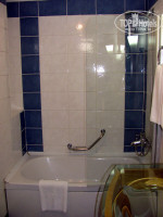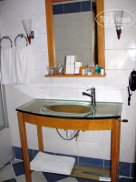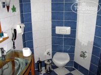 Санузел совмещенный. Ванна очень маленькая. Раковина стеклянная. Телефон, фен. Пузыречки шампуни, геля, мыло, ватные палочки, шапочки, наборы зубная паста-щетка и пена для бритья-станок. Но стены все в трещинах, плитка неаккуратно замазана… Короче, не номер, а рай для любителей выискивать всякие трещины, пятна, сколотые углы и т.д. Вот точно на две недели фотосессий номера хватило бы!