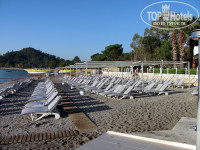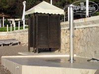 Пляж, когда мы только приехали, толком еще не был оборудован. Стояли лежаки. Небольшой кусок тента был натянут только в одном месте. Когда солнце стало пригревать вовсю и отдыхающие потянулись в тень, тенты так дальше и не натянули, и все ютились на этом маленьком кусочке. Пирс был полностью не собран. Собрали его к 1 мая. На пляже мелкая галька. Если стоять лицом к морю, то справа встречаются довольно крупные камни. С левой стороны получше. В двух концах пляжа есть раздевалки и душ.Заход с правой стороны от пирса в море неудобный. Много крупных камней, есть какая-то каменная плита. Но на мелководье неумеющие плавать плескались с удовольствием. Слева заход более песчаный. Но там встречаются какие-то каменные глыбы с арматурой. Поэтому внимательно надо заходить и смотреть под ноги! Пирс в отеле большой. Есть два спуска. Справа – удобнее, чем слева. С пирса справа сразу попадаешь на глубину, в левой части – есть дно под ногами.
