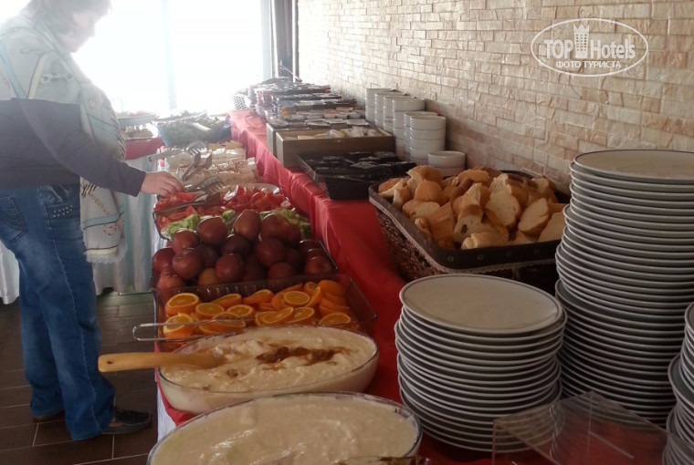 Завтраки - голодными не останетесь (помидоры, огурцы, 2-3 вида сыра, булки, джем, яйца, хлопья, чай, кофе, йогурт), но нет ни сосисок, ни колбасы, вообще ничего мясного. Вид с террасы (есть застекленная и открытая части) потрясающий.