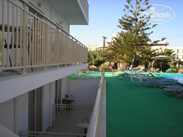 Отель находится в районе Амудара, минутах в 15 от центра Ираклиона, если ехать на автобусе, остановка прямо у отеля. Район довольно тихий, гултяь и развлекаться особенно негде, если ехать без компании- то будет скучно.Никаких фольклорных вечеров и анимации и в помине нет. Отель находится на второй линии, через дорогу, причем бассейн находится в нескольких метрах от презжей части, отделен от нее поляной да Кустарником с деревьями. На фото он кажется большим, но на самом деле- ничего особенного, правда вода в нем морская, соленая. Корпусов в отеле 2, если у вас все включено- то поселят вас в главный корпус, примечание- русских селят в номера похуже, без балкона, с выходом на общую террасу. Если поупансион (завтрак ужин)- то заселяют во второй корпус, поменьше.И опять- возможны варианты. Хочу сразу сказать- там есть минус первый этаж, который находится на уровень ниже площадки с бассейном,те вид из окна- это стена террасы и ноги мимо проходящих отдыхающих. Но в этом есть свой плюс-солнце в номер не попадает, и он так сильно не прогревается, как верхние номера, ну, и если вы сидите на террасе- вас тоже никому не видно, за исключением ваших соседей по подземелью. И терраса больше, чем балкон. Нас разместили как раз в таком номере. Сами номера в этом корпусе довольно приличные, чистые, и светлые, большая ванная, кондиционер, телевизор и холодильник.Теперь о персонале.Такого сервиса давно не встречала, особенно это касается неприветливых девушек с ресепшн, которые сидят с угрюмыми лицами с видом "понаехали тут", не могу сказать, что мы обременяли их своими просьбами. И отдельно хочется сказать о так называемом ресторане, который иначе как СТОЛОВКА,не назовешь. Начиная с обслуживанияи заканчивая оформлением. Есть там конечно можно, попадались и приличные блюда, но сразу скажу- лучше брать завтрак\ужин, а обедать где нибудь в кафе или ресторанчике, что не так уж и дорого, порции большие, салат вообще можно брать один на двоих. В столовой отеля же царит сутолока и неразбериха, столов, посуды и официантов катастрофически не хватает, и часто приходилось сначала долго ловить официанта, и потом опять же ждать, когда он принесет тебе столовые приборы, если они закончились. Теперь пляж. От отеля он недалеко, но опять же, зависит от того, какими средствами вы располагаете. Есть несколько вариантов- делюсь опытом. Шезлонги и зонты на пляже платные, самую высокую цену просят у отеля Агапи Бич. Если пройти немного дальше направо- будет полоса пляша без лежаков, где платить не надо, но от сильного ветра песок летит во все стороны. Если же пойти налево от Агапи бич- то можно загорать на территории таверн, тамдостаточно заказать напиток. Мы ходили обедать в один из ресторанчиков на пляже- и загорали там бесплатно)) Еще один вариант- лежаки у бассейна отеля. Вобщем, что могу сказать- если вы уже взяли путевку и начитались ужасных отзывов- то не все так плохо.В целом, нашим отдыхом мы остались довольны,несмотря на то, что отель средненький, причем раньше он был 4 звезды, но потом одну сняли, уж на 4 никак не тянет, средняя троечка.
