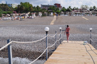 Пляж галечный, зонтики не очень большие, лежаки, матрасы, душ - все на месте. Пирс для захода в воду. В темное время суток он красиво освещается фонарями. На пляже бар, но безалкогольный. Впрочем, полноценный бар в саду - в двух шагах от пляжа. Хотя напитки, конечно, не очень. Пиво ничего, виски со льдом тоже более-менее, вино противное, "соки" порошковые - просто гадость. Коньяка нет. Вот раки (не морские членистоногие, а турецкая водка) хороша, но я лично, много пить ее не мог.