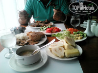 По питанию ставлю О-Т-Л-И-Ч-Н-О !!!! Мясо каждый день не ограничено... говядина очень вкусная. Были перепела, шашлык из курицы, рыбка. Мы попали на сезон манго. Вот это вкуснятина !!! Много овощей, выпечки. Молодцы!!! Тарелки всегда чистые, очередей практически не было, все культурно. Пиво вкусное, но какое-то безалкогольное. В баре, который рядом с торговыми рядами, мне так понравился один бармен!!! Вот сразу видно, парень на своем месте !!!!!!! Он так виртуозно подкидывал лед и ловил его за спиной не глядя стаканом, аж дух захватывало !!! А потом доливал туда всякого-всякого и взбалтывал все это так, что ни одна капелька не падала!!! Молодчага !!!