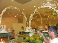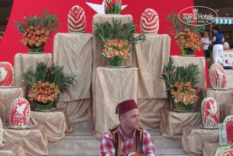 Ресторан бесподобный и огромный! Все очень вкусно! Мы попали на праздник Дня Победы в Турции, поэтому в отеле организовали изысканное пиршество, и конечно в еженедельную турецкую ночь все было очень вкусно и красиво, приехали кочевые магазины в отель и верблюды, на которых можно было покататься за доплату ). Было необычно и интересно.