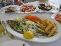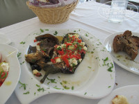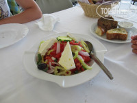 Мы брали тур с включенными завтраками/ужинами. Завтраки не сказать что разнообразные но достаточные – мюсли с молоком, йогурт с консервированными персиками, хлеб, сыры, ветчины, салаты с помидорами, яйца во всех вариациях, оливки, ну и конечно же круассаны и печеньки с шоколадной пастой и вареньем. Попить можно кофе, чай, компот, напитки. Питание организовано в виде шведского стола. На ужин обычно вида три салатов, постоянно мясные блюда. Рыбу давали редко, но за время отдыха попробовали жареных кальмаров, салат из осьминогов и вида три рыбы. Часто был плов с мидиями, разнообразные макароны, жареные овощи, фаршированные перцы. Также на ужин давали арбузы, дыни, персики и нектарины. На ужин, когда занимаете стол, персонал приносит графин с холодной водой. Воду они наливают из под крана, пить её можно. На обед мы иногда покупали фрукты у проезжающих мимо пляжа греков/цыган: черешню (2 евро кг), персики, нектарины и апельсины (1 евро кг). Апельсины местные очень вкусные, таких у нас не купить. Пару раз покупали в магазинах местные йогурты, сыр и вино. Также на обед попробовали их местную шаурму – гиру. Нам не понравилась – уж очень соленное мясо в ней. Изредка ходили в местные таверны – попробовать местные блюда. Жаренный осьминог так себе на вкус, кальмары гораздо лучше. Попробовали креветки саганаки в томатном соусе с сыром-очень вкусно. Пиво местное очень вкусное, можно смело брать. Цены в ресторане при отеле на уровне окрестных таверен, поэтому в основном обедали в нём. Готовят отлично, после каждого обеда вам принесут или арбуз или мороженное со сладостями. Обед на троих в среднем выходил 17-30 евро.