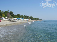 Сам отель позиционируется как две звезды, но если сравнивать с Болгарией, то это крепкая тройка. Территории как таковой нет. Парковка, крытая терраса со столиками, рядом бар и лужайка с зеленью, пляж отделен грунтовой дорогой, по которой ездят торговцы с фруктами и отдыхающие. Пляж частично песчаный, вход мелкая галька, перемежающаяся с камнями. Спец обувь для входа в воду маст хэв. Её можно купить за 6 евро за пару в ближайшем магазине. Рядом с пляжем есть туалет и краны с холодной водой, чтобы смыть песок. Море всегда разное. В штиль прозрачное как слеза. Иногда течением приносило водоросли. Пару дней были огромные волны. Мы даже ощутили два раза, что такое гроза на Олимпе. Это надо видеть.