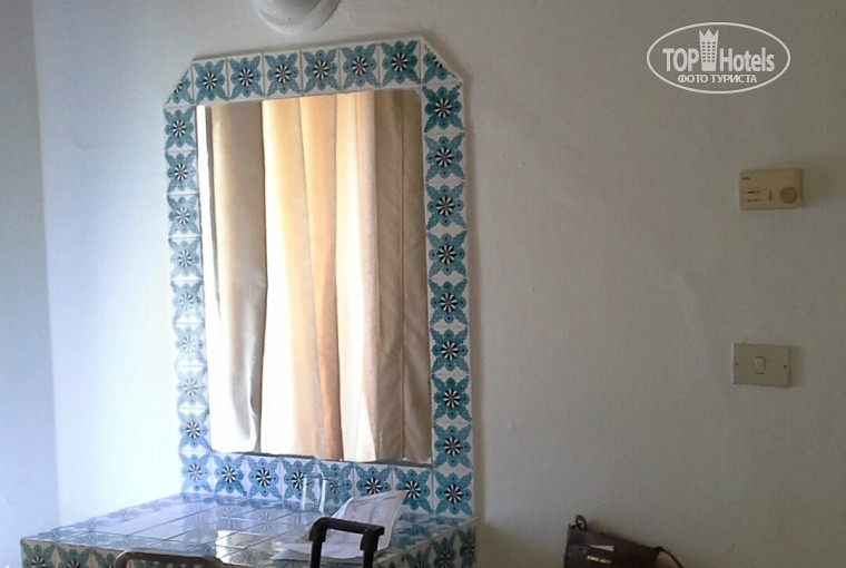 Сам номер в старинном стиле, вместо привычной деревянной мебели - поверхности, выложенные плиткой, кроме кровати конечно.