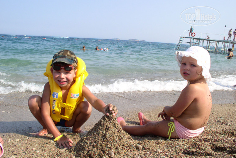 Пляж галечный, но местами есть песок, есть где деткам "поковыряться".