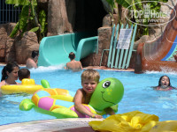 В детском бассейне горка маленькая-совсем для малышей, мои детки катались с кругами с двух больших горок. Жаль только, что они работали всего 2 часа в день: с 11до 12 и с14 до 15. Маловато!!! Были даже небольшие очереди на горки. Бассейн сильно хлорирован, однажды дочка залезла туда в ярко-голубых х/б трусиках, через пол-часа они стали бледно-зелеными... Мы в бассейне были только 1 час в день с 14 до 15 - когда работали горки, остальное время на море плескались. На пляже бесплатно дают кататься на пластиковых байдарках-сын был в восторге! Остальные водные развлечения платно (парашют, скутер и т.д.)