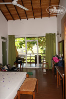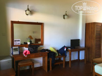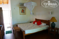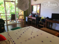 Номер очень просторный (см. фото), мебель хоть и не новая, но есть всё необходимое, всё чисто и удобно, сантехника хорошая, есть сейф в шкафу, кондей (мы им не пользовались, боялись простыть), вентилятор, небольшой холодильник. Есть балдахин над кроватью от москитов, но мы ей не пользовались, а включали на ночь фумигатор. В номере много розеток, переходники мы брали на ресепшене. ТВ ни разу не включали.))) Балкон очень просторный, вид с него очень красивый, прямо на реку Бентота и на сад на территории отеля (см. фото). На балконе стоит стол, две скамейки, два шезлонга и сушилка для белья. Пару раз мы даже заказывали ужин в номер, это очень удобно, и по цене не очень дорого.
